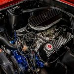 Step inside the cabin, and you'll be greeted by a sleek black interior that perfectly complements the red exterior. The classic styling continues with comfortable black leather seats, offering a combination of luxury and sportiness. The attention to detail is evident throughout the interior, with chrome accents and a well-designed dashboard that showcases the Mustang's heritage.